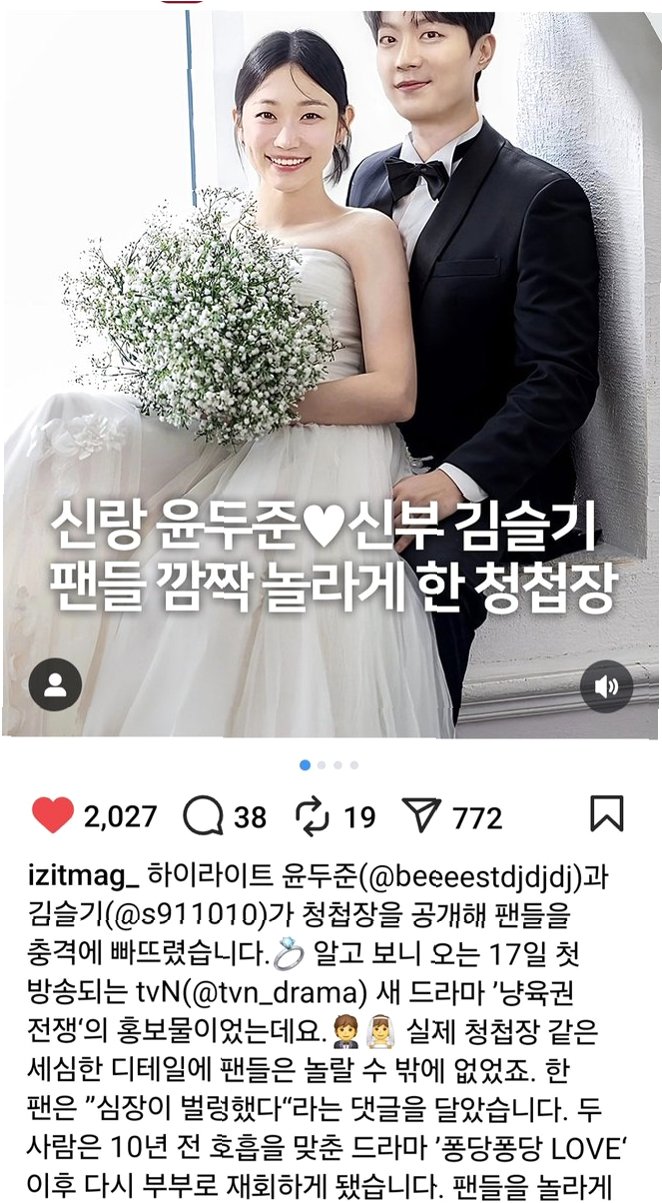 배우 윤두준과 김슬기가 드라마 속에서 부부의 연을 맺는다는 소식이 전해지며 팬들의 이목을 집중시켰습니다. tvN 드라마 공식 SNS를 통해 공개된 웨딩 화보 사진은 마치 실제 결혼을 연상케 하며, 많은 이들의 궁금증을 자아냈습니다. 사진 속 두 사람은 웨딩드레스와 턱시도를 입고 행복한 미소를 짓고 있어 더욱 눈길을 끌었습니다. '윤두준♥김슬기 2025년 8월 17일 일요일 오후 9시 20분'이라는 문구는 마치 실제 결혼 발표처럼 보였지만, 곧 반전이 드러났습니다.
