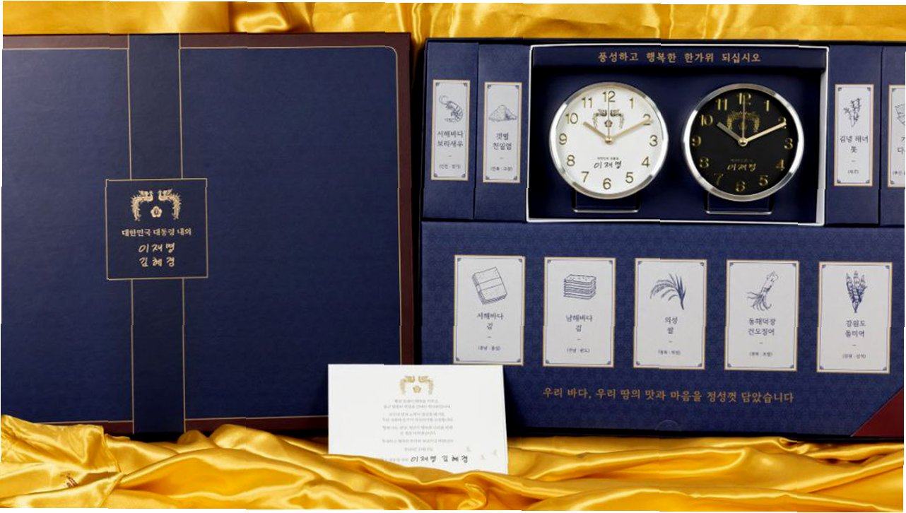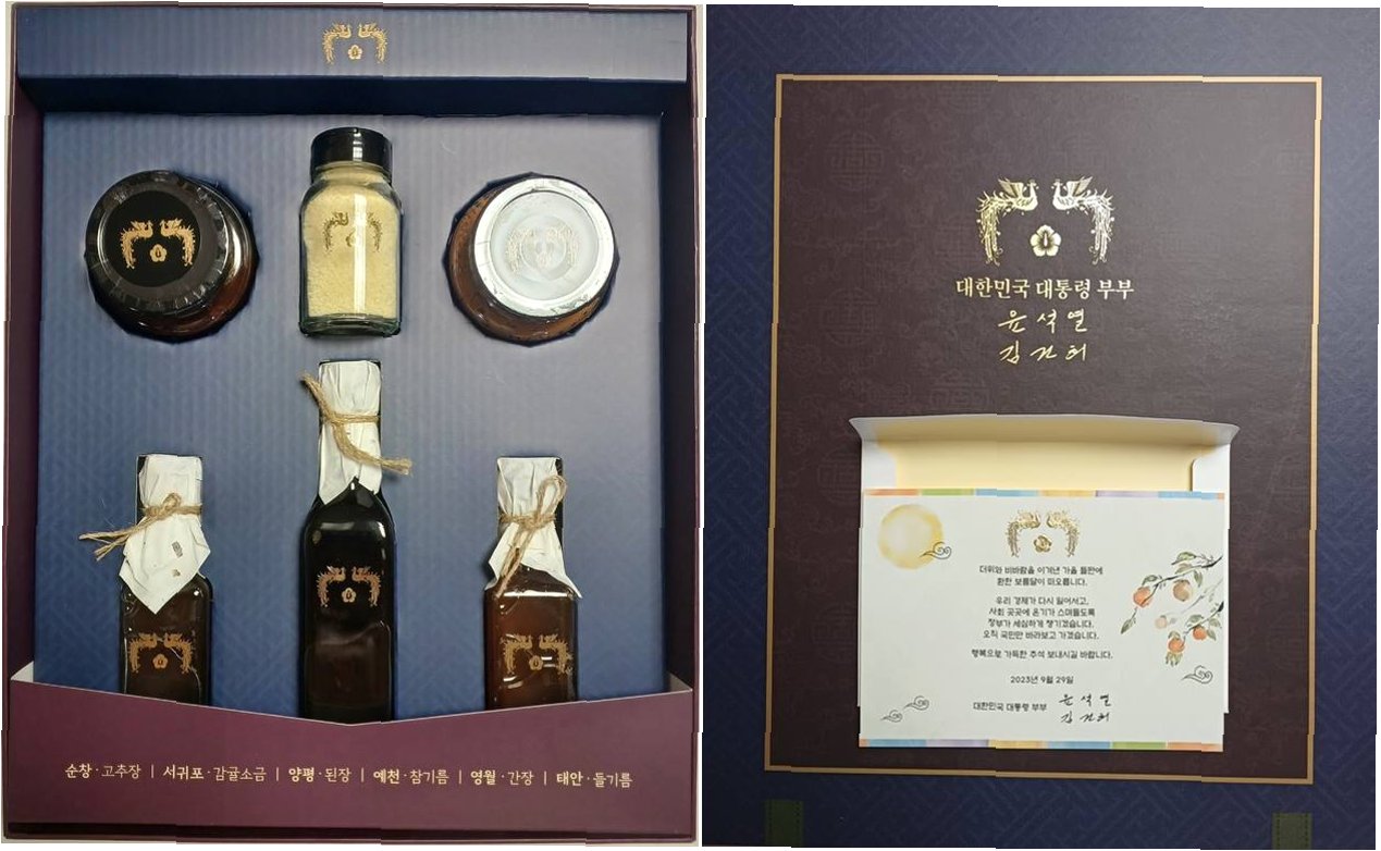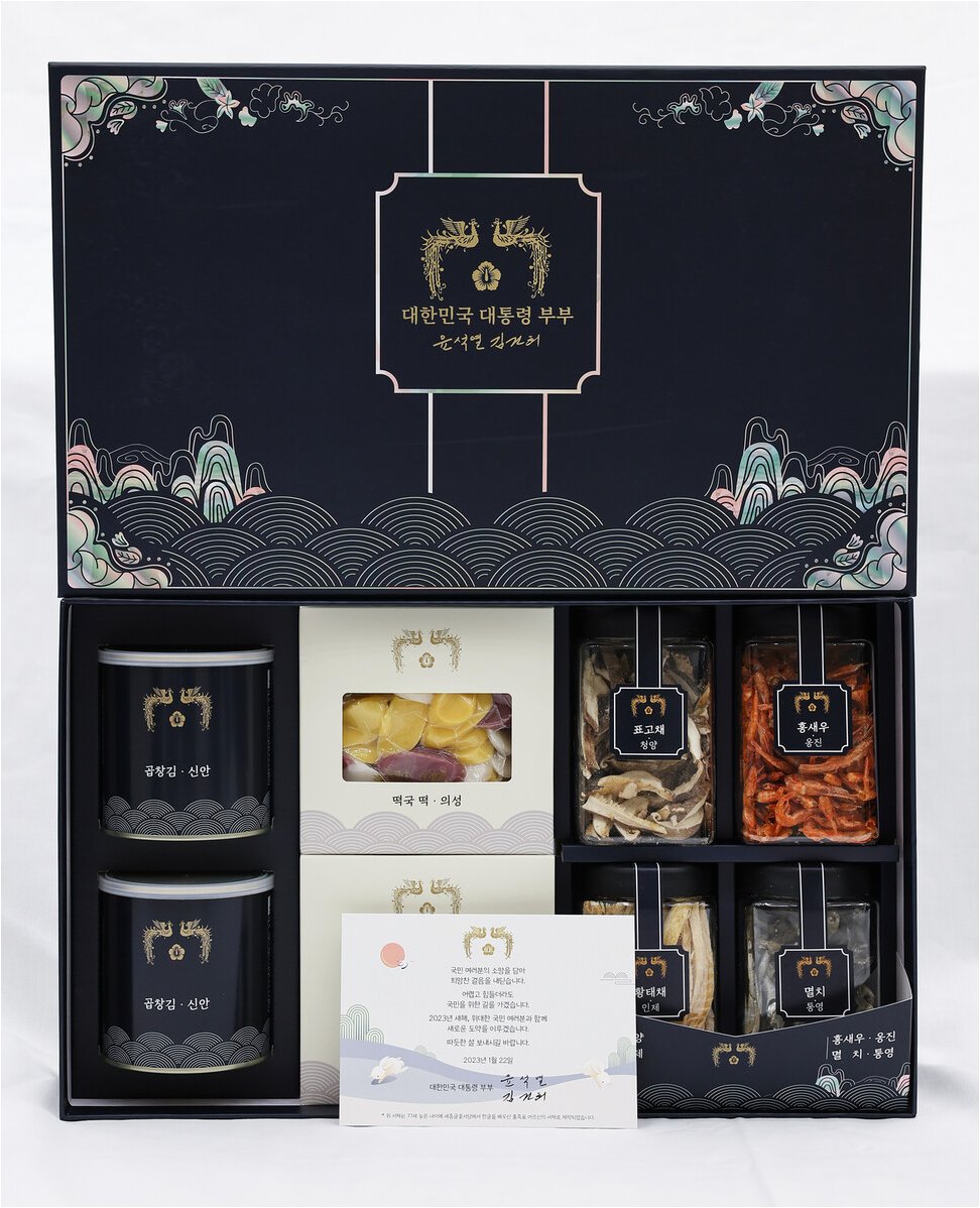 A.대통령 서명이 담긴 탁상시계, 8도 수산물, 경북 의성 쌀 등으로 구성되어 있습니다.