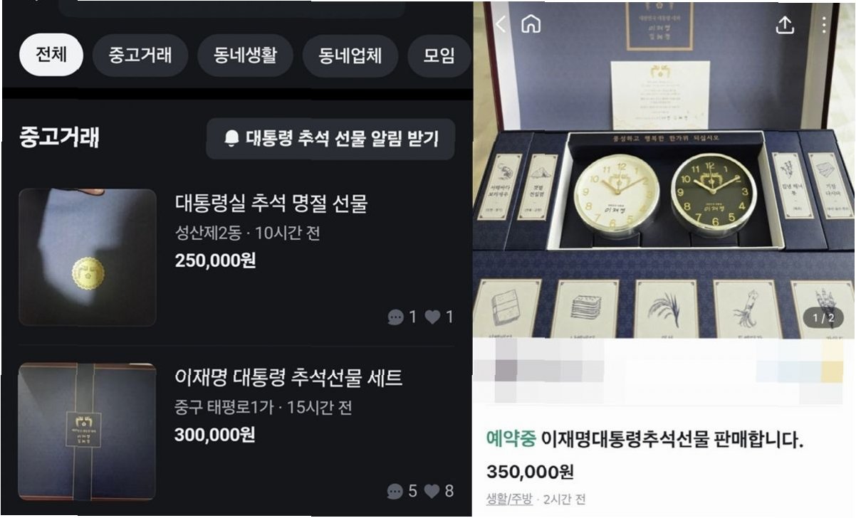 이재명 대통령의 취임 후 첫 명절 선물이 공개된 지 이틀 만에 중고거래 플랫폼에 등장하여 많은 이들의 눈길을 끌었습니다. 26일 기준, 당근마켓에는 이 대통령의 추석 선물 판매 글이 여러 건 올라와 있는 상황입니다. 한 판매자는 ‘이재명 대통령의 첫 선물 세트다. 전통 디자인이 고급스러운 탁상시계 2개와 각 지역 특산물이 포함돼 있다’고 설명하며 판매를 진행하고 있습니다. 이러한 현상은 단순한 거래를 넘어, 사회적 관심과 다양한 해석을 낳고 있습니다.