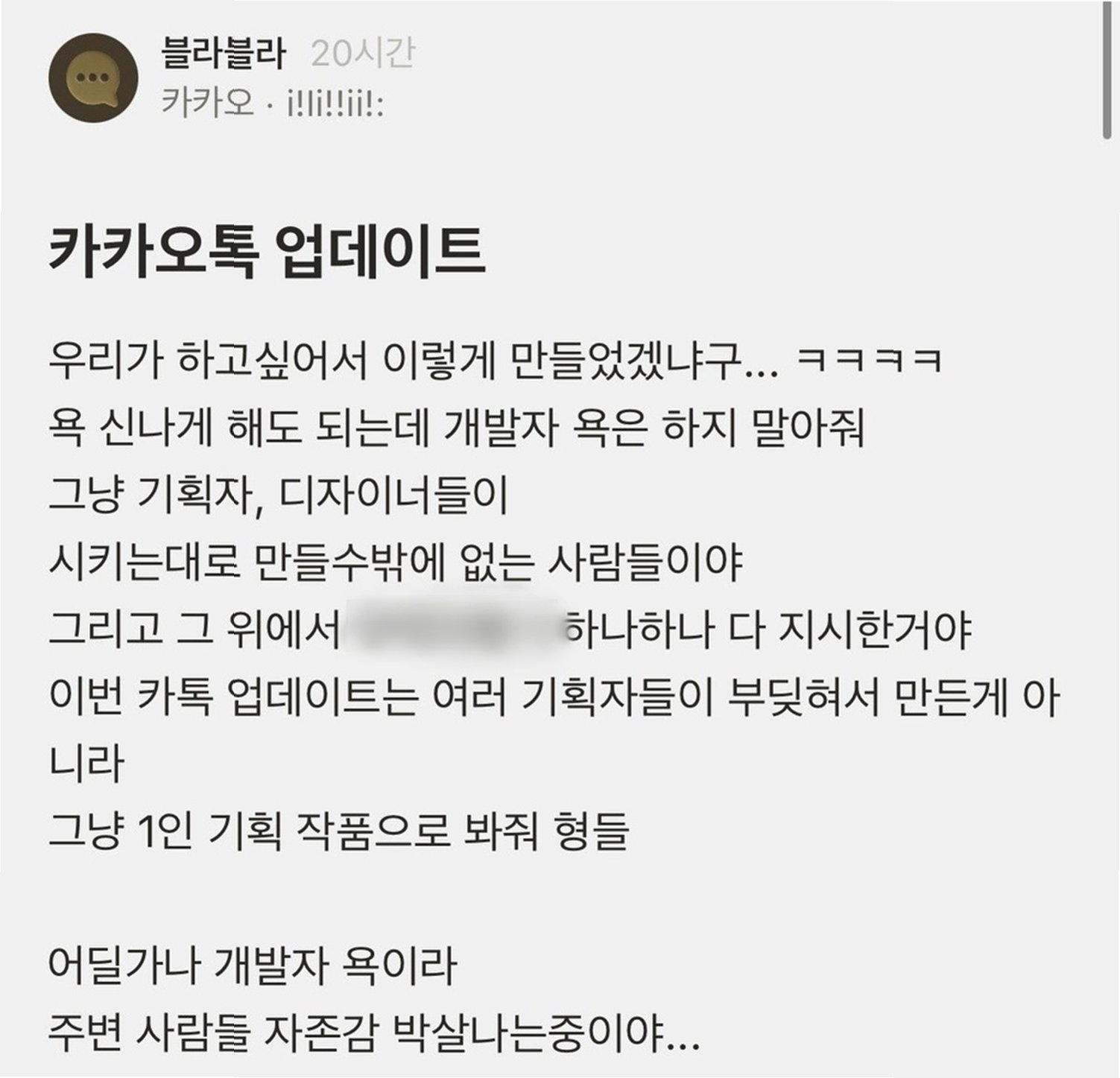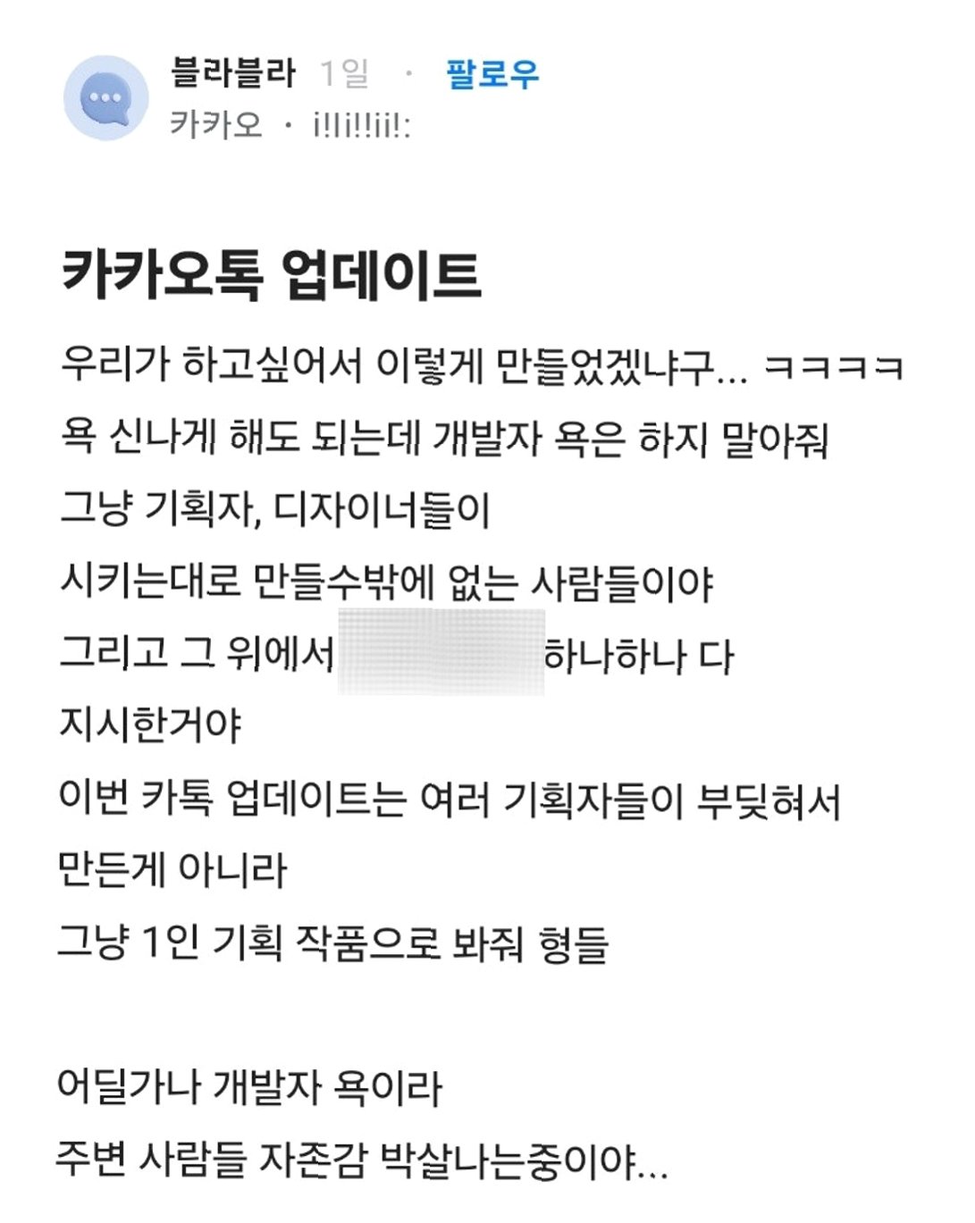 직장인 익명 커뮤니티 블라인드에 올라온 글에 따르면, 카카오 재직자로 추정되는 A씨는 ‘개발자 욕은 하지 말아달라. 시키는 대로 만들 수밖에 없는 사람들’이라며, 개발자들을 향한 비난을 자제해 줄 것을 요청했습니다. A씨는 이번 카카오톡 업데이트가 여러 기획자들의 합의가 아닌, 한 명의 기획자가 주도한 결과임을 강조하며, ‘위에서 하나하나 다 지시한 것’이라고 밝혔습니다. 이는 개발자들이 사용자들의 불만을 온전히 반영할 수 없는 구조적인 문제점을 시사하며, 개발자들의 어려움을 이해해 달라는 간절한 호소로 이어졌습니다. 개발자들은 주어진 환경 속에서 최선을 다하고 있지만, 그들의 노력과는 별개로 사용자들의 불만이 커지고 있는 현실에 대한 안타까움을 드러냈습니다.