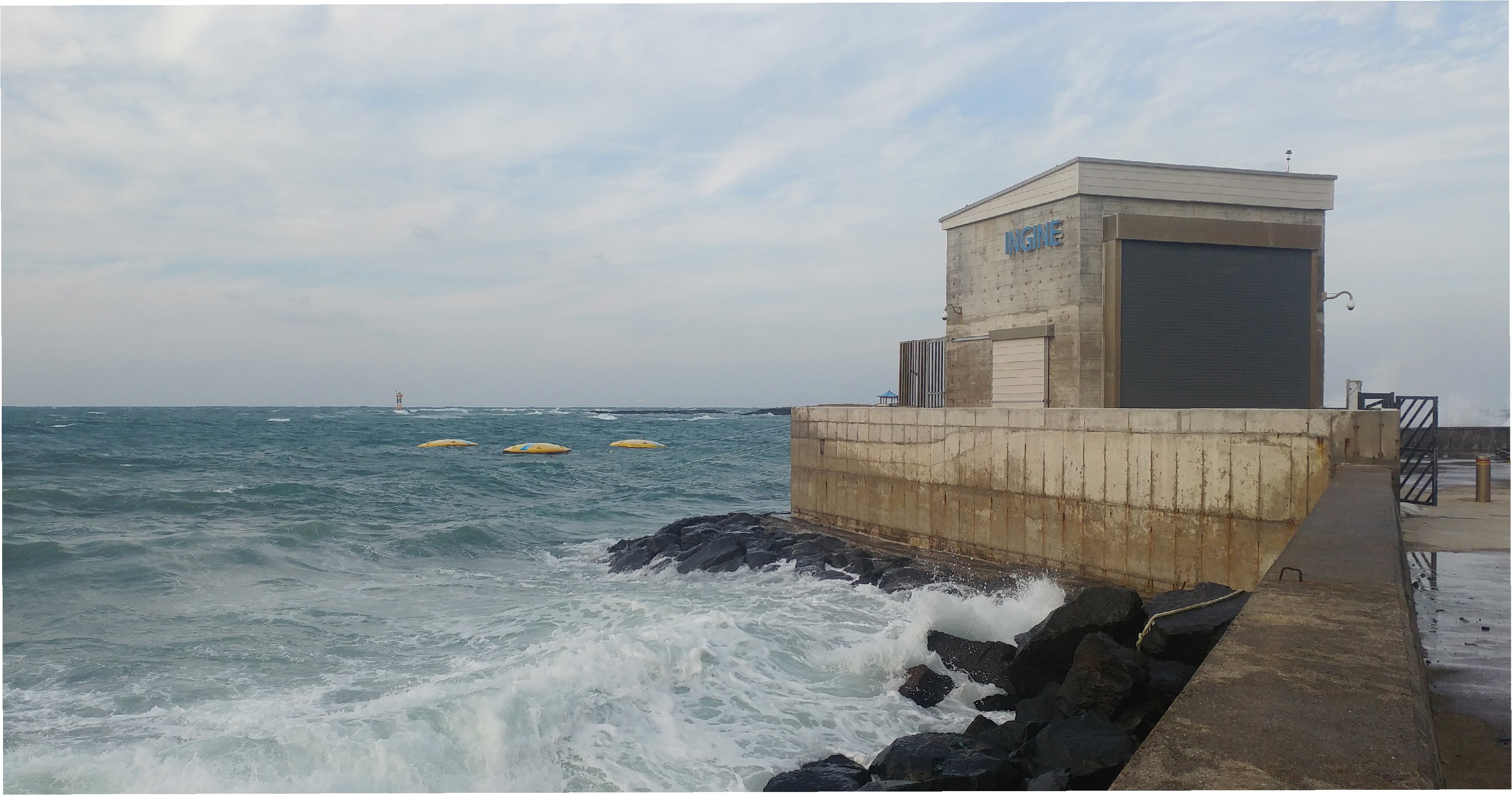 이 구조물은 국내 최초로 파도의 힘을 이용해 전기를 생산하는 ‘용수시험파력발전소’입니다. 해안에서 1.2km 떨어진 바다 위에 위치하며, 가로 32m, 세로 23m, 높이 10m 크기로 수심 16m 깊이에 고정되어 있습니다. 이 발전소는 파도의 움직임을 활용하여 전기를 생산하는 혁신적인 기술을 선보입니다.